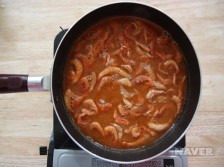 03. 냄비에 쌀뜨물을 붓고 된장, 고추장을 푼다. 마른 새우를 넣어 끓인다. 바글바글 끓어오르면 중간 불로 줄여 한소끔 끓인다.